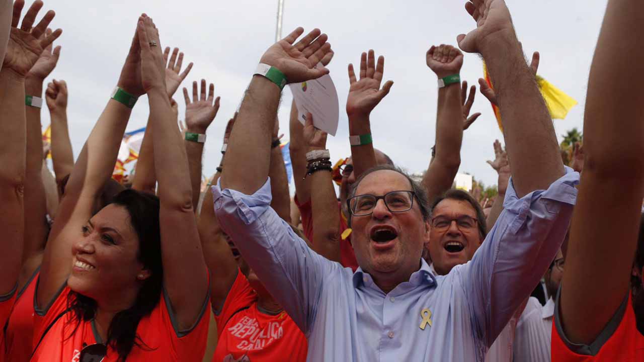 Esos dos partidos movilizaron ayer a decenas de miles de catalanes en una Diada que el lunes calentó el presidente de la Generalitat con un discurso que hace inconcebible que su partido pueda ser uno de los que sostienen al Gobierno democrático de España: comparó la situación actual de Cataluña con la que se vivió en la guerra de sucesión a principios del siglo XVIII (un desvarío histórico propio de un lunático), proclamó que su Gobierno está comprometido «con hacer efectiva la república», negó de nuevo que España sea una democracia y reivindicó la plena vigencia de la insurrección independentista: «Lo haremos -dijo Torra- por todos los presos políticos y exiliados y todos aquellos que son perseguidos por defender la libertad de Cataluña y por haber dado la palabra al pueblo en el referendo del 1-O».