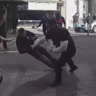 imaginemos esta misma acción, pero en lugar de este hombre pongamos a los dos principales partidos de oposición de centroderecha: dudarían en pegarle la hostia unos segundos, los cuales serían aprovechados por el perroflauta para arrearles primero y así quedar nokeados y en ridículo.