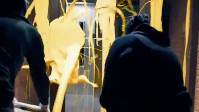 Arran es la organización juvenil de la CUP. A través de su cuenta de Twitter, ha difundido un video en el que dos personas, con la cara tapada, esparcen cubos de pintura amarilla en la entrada del bloque donde vive la familia de Llarena.