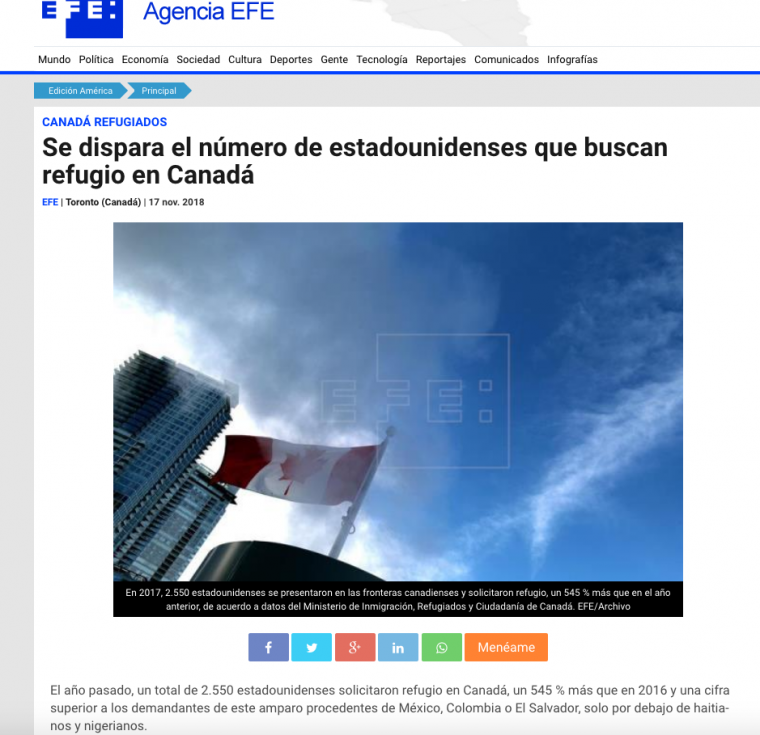 La Agencia EFE miente al afirmar que “se dispara el número de estadounidenses que buscan refugio en Canadá”