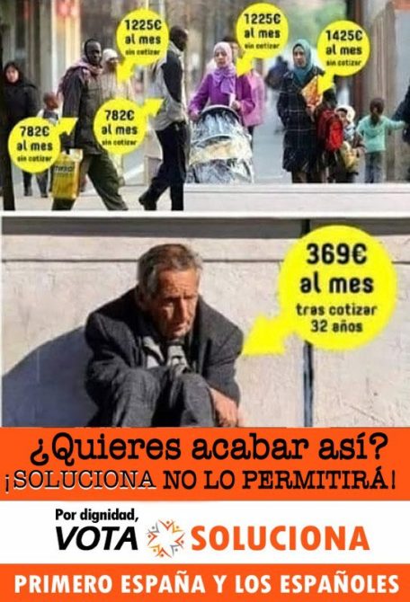 “Con SOLUCIONA, ningún inmigrante ilegal comerá gratis mientras haya un solo español que pase hambre” Hombre, es que lo que tiene que pasar no es que los ilegales coman o no sino que no haya ilegales. Y de los legales que quedasen habría que dar un repaso a fondo para ver los que son legítimos y los que obtuvieron su permiso tras “okupar” nuestro país, y obviamente ponerlos de patitas en su casa, que no es esta. De esa forma nos librarimos de 3 cuartas partes de la inmigración si no más. Entonces ya se vería a quien se da… Leer más »