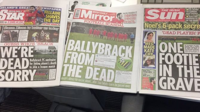 El Ballybrack F.C. reconoció este miércoles su terrible equivocación cuando fingió la muerte de Lafuente, para lograr el pasado fin de semana la suspensión de un partido de la liga regional. La directiva del Ballybrack F.C. colgó hoy en su perfil Facebook un comunicado en el que pide perdón por el «grave error de juicio» cometido por un miembro de su equipo técnico, quien ha sido apartado de sus funciones, mientras investiga el suceso. «Este error, inaceptable y serio, está fuera de lugar y ha sido cometido por una persona que ha estado atravesando dificultades personales, sin que lo supieran otros miembros del club», señaló el Ballybrack F.C. en el citado comunicado.