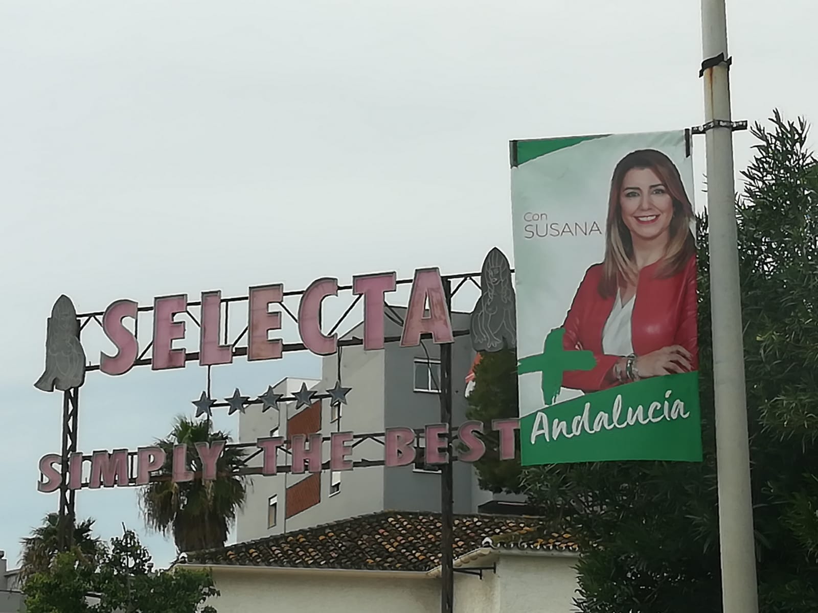 Muy bonita la foto de la banderola de la candidata delante de su lugar de trabajo.