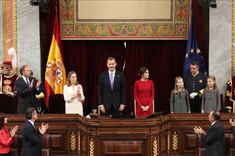 En su discurso, Don Felipe ha citado palabras de los padres de la Constitución y ha reconocido el papel de su padre, Juan Carlos I, en el impulso de la monarquía parlamentaria “de forma decisiva y determinante”, con el “apoyo permanente y comprometido” de la Reina Sofía, unas palabras que han sido recibidas por un largo aplauso del hemiciclo.