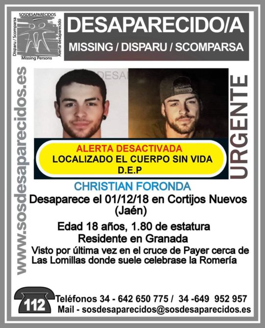 Unos cazadores encontraron ayer por la tarde el cadáver, que a falta de confirmación por la autopsia, puede ser el de Christian Foronda, de 18 años , desaparecido el 30 de noviembre en Cortijos Nuevos (Jaén).