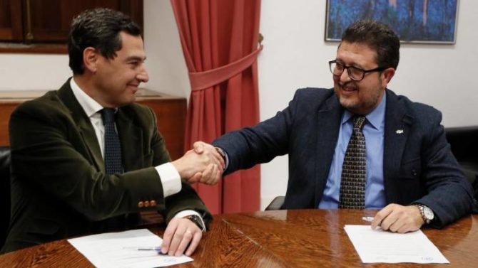 Después de la firma del pacto entre Partido Popular y Ciudadanos por el que el partido naranja hará presidente a Juan Manuel Moreno Bonilla y el líder de Cs en Andalucía será vicepresidente autonómico, ha llegado el acuerdo a dos entre PP y Vox para apoyar la candidatura de Juanma Moreno. Un acuerdo del que Ciudadanos se desvincula totalmente y justifica que “en ningún momento podrían vincular al Gobierno de la Junta ni al pacto de 90 medidas” al partido que dirige Santiago Abascal.