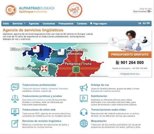 Optilingua International ha reforzado su presencia en País Vasco y Navarra con la creación de ALPHATRAD EUSKADI SERVICIOS DE TRADUCCIÓN S.L., que contará a partir de ahora con cuatro nuevas sucursales: en Bilbao/Bilbo, San Sebastián/Donostia, Vitoria-Gasteiz y Pamplona/Iruña. Con estas nuevas oficinas, esta empresa, de ámbito internacional, responde a la creciente demanda de servicios lingüísticos y de traducción en la zona y le permite reducir distancias con sus socios comerciales.