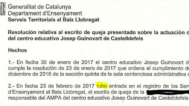 Los gazapos aparecen en un comunicado oficial, con sello del departamento de Enseñanza de la Generalitat y firmado por la responsable territorial del Baix Llobregat. La administración autonómica responde a una queja presentada por un grupo de familias de la Escuela Guinovart de Castelldefels (Barcelona) en 2017. La queja está relacionada con la actuación del centro respecto a la orden del Tribunal Superior de Justicia de Cataluña (TSJC) de impartir el 25 por ciento de las clases en castellano a varios alumnos del centro.