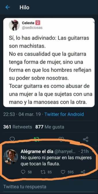En ese contexto, esto es lo que ha dejado escrito en Twitter la usuaria Celeste, vinculada a la izquierda radical: “Las guitarras son machistas. No es casualidad que la guitarra tenga forma de mujer, una forma en que los hombres reflejan su poder sobre nosotras. Tocar la guitarra es como abusar de una mujer a la que sujetas con una mano y la manoseas con la otra”.