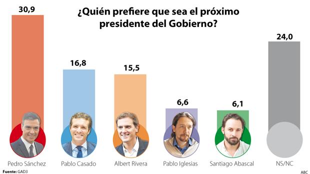 Entre los votantes del PP, un 82 por ciento prefiere a Casado como presidente, un 6 por ciento vería mejor a Rivera y un 3 por ciento, a Abascal. Los electores de Ciudadanos son igual de previsibles: el 78 por ciento prefiere a Rivera en La Moncloa y el 6 por ciento, a Casado.
