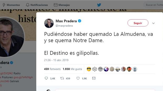 Pese a la consternación generalizada, hubo algún otro que no quiso desaprovechar la ocasión para malmeter por su causa, aunque fuera de muy mal gusto. Fue el caso del guionista y presentador de televisión Máximo Pradera, que deseó que el incendio hubiera ocurrido en La Almudena. Además, remataba su frase con que «el destino es gilipollas».