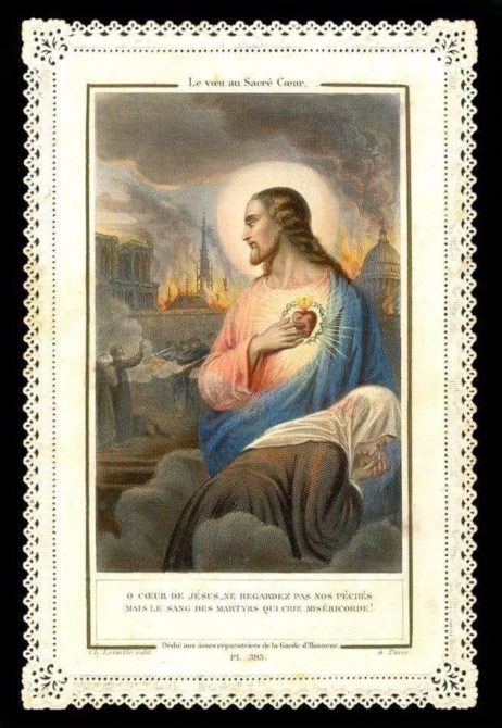 Incluso, el religioso subió una estampa hecha en 1956, en donde se aprecia claramente que, detrás de Jesucristo con su corazón señalado, arde la nave principal de Notre Dame, no así sus torres, tal como ocurrió. A la izquierda de Jesús aparece la Basílica de San Pedro, rodeada de llamas, mientras abajo un ángel es fusilado por soldados.