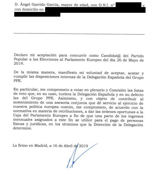 En dicho documento, Garrido declara su «aceptación para concurrir como candidato del Partido Popular a las elecciones al Parlamento Europeo del día 26 de mayo de 2019». «De la misma manera —prosigue la declaración jurada de Garrido—, manifiesto mi voluntad de aceptar, acatar y cumplir las disposiciones internas de la Delegación Española del Grupo PPE».