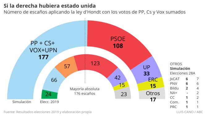 Una vez aplicada la ley d’Hondt con sus votos sumados, los resultados habrían sido los siguientes. El hipotético partido PP+Cs+Vox+UPN: 177 escaños. El PSOE habría conseguido 108 en lugar de los 123 que logró, 15 escaños menos. Unidas Podemos habría perdido nueve escaños ya que pasaría de 42 a 33.