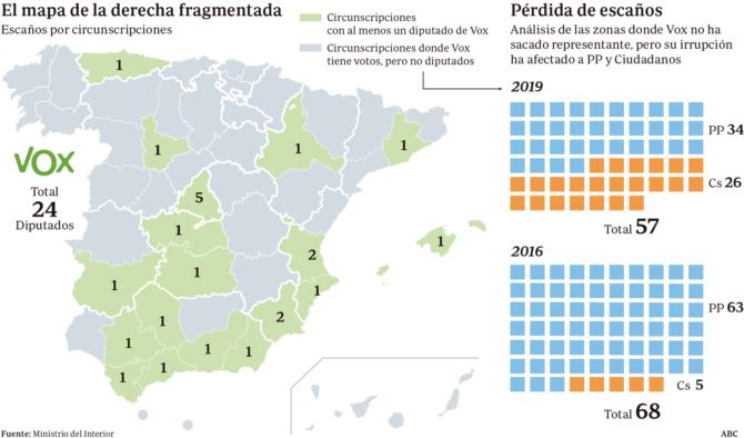 Esos casi 700.000 votos de Vox, que a la postre se han ido a la papelera, inocularon el veneno de la fragmentación en el centro-derecha y posibilitaron un vuelco electoral cifrado en 23 escaños a favor del PSOE y Unidos Podemos. En estas 34 circunscripciones -de todos los tamaños y ubicadas en todas las latitudes de la geografía nacional- PP y Ciudadanos (Cs) aglutinaron 68 escaños en las elecciones del año 2016. Entonces el PP impuso su ley con 63 parlamentarios frente a los 5 del partido que ya lideraba Albert Rivera. El PSOE de Pedro Sánchez se tuvo que conformar en aquella cita con 37 escaños que, sumados a los 19 de Unidos Podemos, alcanzaron los 56. De esta forma el centro-derecha batió por 11 escaños a la izquierda en el cómputo global de estas 34 circunscripciones.