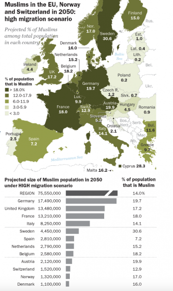 Finalmente, y en un escenario de inmigración “alto”, en el que se combinaría la persistente llegada de refugiados con la venida de nuevos inmigrantes, prácticamente en su totalidad provenientes de países islámicos, la población musulmana en Europa podría alcanzar el 14%, siempre teniendo únicamente en cuenta la población “oficial” de refugiados e inmigrantes, ya que los llegados a través de redes de inmigración ilegal, que se cuentan por cientos de miles, son prácticamente indetectables.
