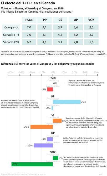 Por el contrario, las segundas opciones quedaron desatendidas. Tanto en el caso del PP como en el de Ciudadanos y el de Vox, los segundos de sus listas al Senado recibieron un millón de votos menos que los primeros. En el caso de los populares, el número de votantes fue similar al de sus listas al Congreso, pero en el caso de Cs fue un 20% menos; y en el caso de Vox, casi un 40% menos. Hicieron el 1+1+1 al Senado.