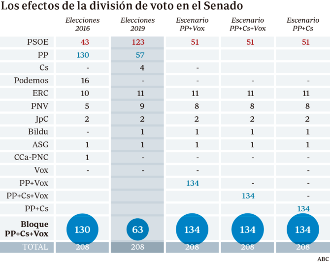 En cualquier caso, el 1+1+1 al Senado, aunque infructuoso, no fue letal para la derecha. Los resultados apenas habrían variado en algunas circunscripciones. La derecha acabó con sus posibilidades por la división en tres partidos. Unidos los votos del PP, Ciudadanos y Vox habrían logrado 134 senadores y el PSOE 51, y lo mismo habría ocurrido con la suma de los votos de PP y Cs o la de PP y Vox.