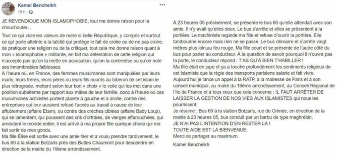 En su texto, Benckeikh explica que en estos momentos, en Francia, las mujeres musulmanas están dominadas “por sus padres, hermanos y maridos” y que algunas grandes empresas están siendo sumisas ante esta realidad. Pide responsabilidades y demanda que la compañía de autobuses se disculpe ante su hija. Como consecuencia, recibe múltiples insultos y amenazas a través de la red social y Facebook… le cierra la cuenta por “incitar al odio”. “Solo publiqué lo ocurrido porque quiero denunciar la deriva en la que estamos metidos”.