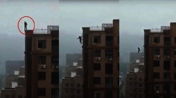 Después de unos segundos y algunos movimientos, el joven da un pequeño paso atrás y la estructura empieza a desprenderse bajo sus pies. Pese a sus intentos por aferrarse a la plataforma, finalmente acaba cayendo del edificio.