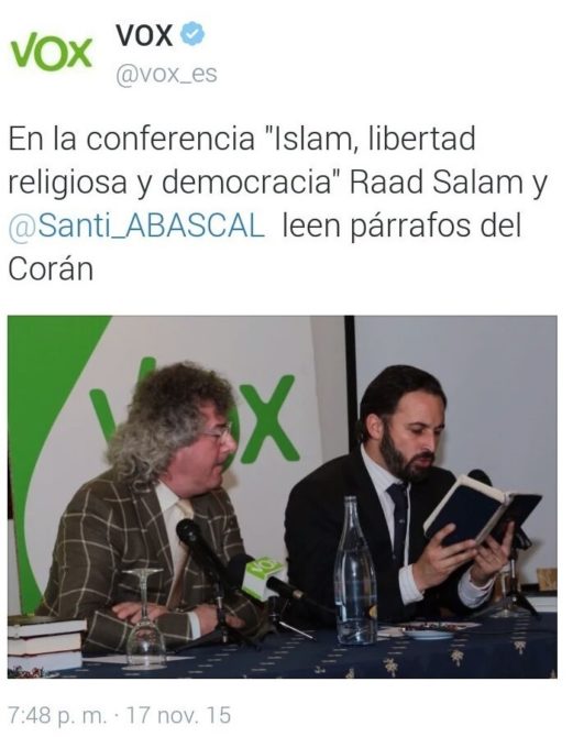 El goteo de decepciones y contradicciones de Vox empieza a ser torrentera. Nos dijeron que el islamismo era una de las líneas rojas de Vox. Hoy sabemos que Santiago Abascal fue el ponente de una conferencia sobre “islam, libertad religiosa y democracia” que tuvo lugar en el hotel Veláquez en 2014. Junto a él, el entonces cadidato de Vox al Congreso Raaz Salam, de origen iraquí.