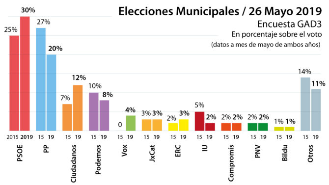 El PSOE ganaría las elecciones municipales de este domingo con un 30% de los votos, según la última encuesta de GAD3. Son cinco puntos más que en 2015 y dos más que en el sondeo publicado por el diario ABC hace una semana. Junto al PP, que está en la segunda posición con un 20%, sumarían la mitad del voto escrutado. Ciudadanos (12%), Podemos (8%) y Vox (4%) empeoran sus expectativas con respecto a la semana pasada.