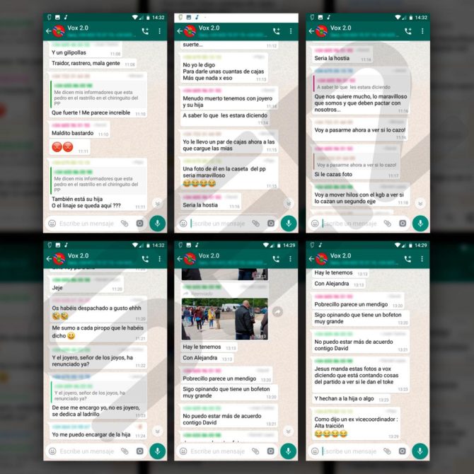 En su denuncia, Cuadrado señala que sufre “desde su dimisión violencia instrumental y hostil” por parte de Fernández y sus afines en la agrupación local. La denuncia incluye unas fotos que le hicieron sin su conocimiento mientras hablaba con la líder del PP en San Fernando de Henares a la que se encontró en el mercadillo de la localidad. Entre las fotos y pantallazos del grupo de WhatsApp Vox 2.0, se puede leer: “Gilipollas, traidor, rastrero, mala gente, maldito bastardo”, “tiene un bofetón muy grande” o “yo me puedo encargar de su hija”.