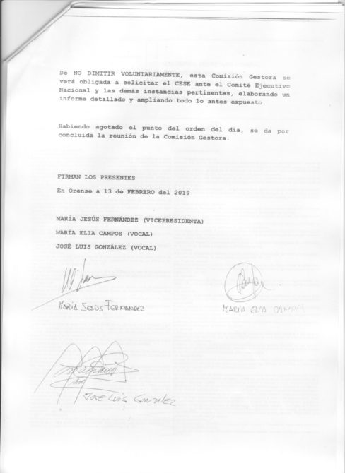 El 13 de febrero pasado, María Jesús Fernández se reunió con los dos vocales de la Comisión Gestora, María Elia Campos y José Luis González, firmando un escrito (que adjuntamos) para solicitar la dimisión y, en su defecto, el cese del presidente de la Comisión Gestora, ante el Comité Nacional.