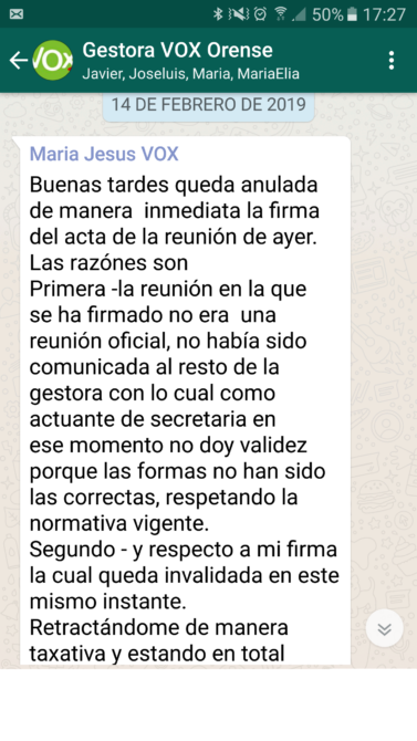 Al día siguiente, se retractó de esa firma, según ella, aduciendo presiones, porque “se vio expuesta, con la mirada de tres personas, para firmar un documento”, tal y como reconoce en el audio que se adjunta, en una conversación con el número 5 de su candidatura, Enrique García Tamargo.