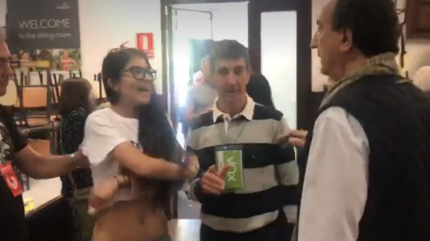 Poco después de las 11 de la mañana, ha habido uno de los momentazos de la jornada, que ha captado las cámaras de La Sexta. Y es que una apoderada de ERC se ha quedado momentáneamente en sujetador, como podemos ver en la imagen, cuando un apoderado de Vox le pidió que se quitara su camiseta independentista. El colegio electoral estaba situado en Barcelona, en la calle Roselló, y un cámara de La Sexta ha captado el momento.