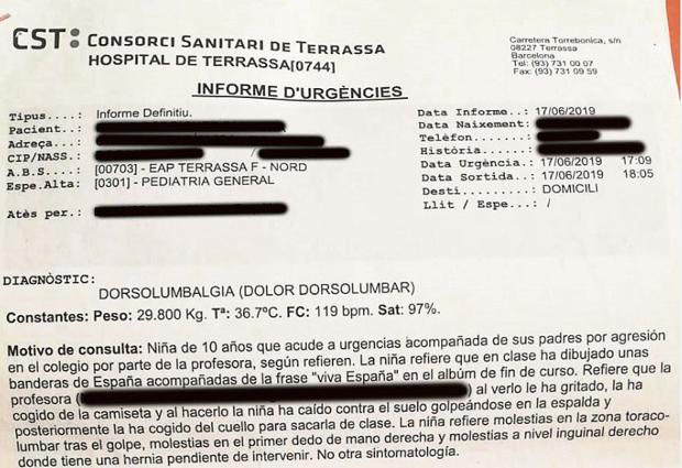 Según informa el diario ABC, que ha tenido acceso al parte médico, la madre de la niña relata que tras pintar las banderas en el cuaderno acompañadas con el lema «Viva España», la profesora gritó a la menor, la «cogió de la camiseta y al hacerlo la niña cayó contra el suelo golpeándose en la espalda». Prosigue el parte que «la docente la cogió del cuello para sacarla de la clase». Los hechos tuvieron lugar en un centro escolar de la red pública que oferta educación infantil y primaria.