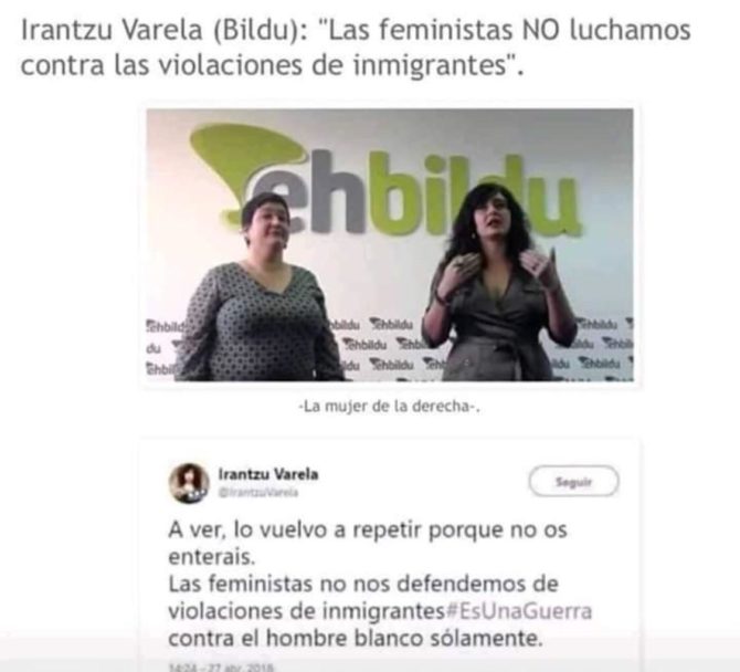 La excandidata de Bildu Irantzu Varela es un buen ejemplo de la doble moral de muchas feministas. Al menos a esta prenda hay que reconocerle el mérito de no andarse con subterfugios dialécticos. Ha reconocido alto y claro en un twitter que “las feministas no nos defendemos de las violaciones de inmigrantes”, rematando su vómito con una frase reveladora de su hediondez moral: “Es una guerra contra el hombre blanco solamente”. ¿Comparte sus palabas el nacionalismo etnicista vasco?