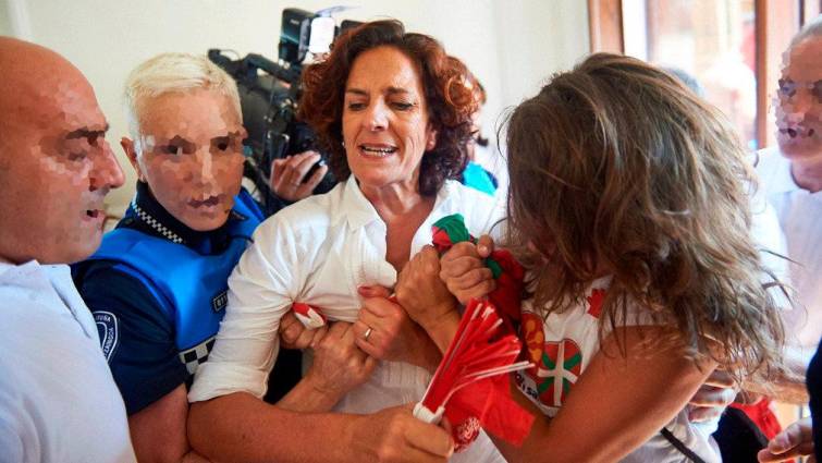 La edil de Geroa Bai, Itziar Gómez, junto a Maider Beloki (EH Bildu) forcejean con la Policía Municipal al intentar colar una ikurriña en el balcón del Ayuntamiento.