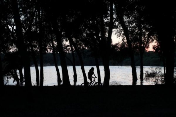 Una chica conduce en bicicleta por un bosque en Alemania.