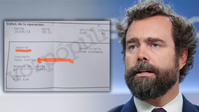 Carlos Aurelio Caldito, exvicepresidente de Vox en Badajoz y afiliado al partido hasta mediados de 2018, presentó como prueba un recibo bancario que obtuvo durante su etapa en el partido en el que consta “concepto pago cuotas, beneficiario Iván Espinosa”, al que ha tenido acceso Vozpópuli.
