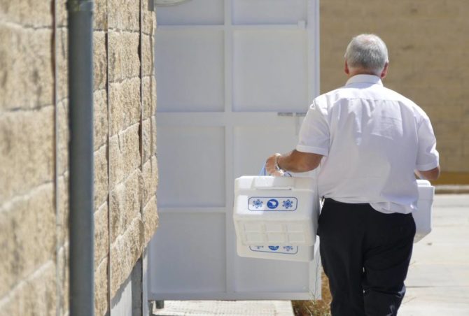 Un operario del Ayuntamiento de Sevilla llega con unas neveras para recoger muestras en la sede de la empresa Magrudis
