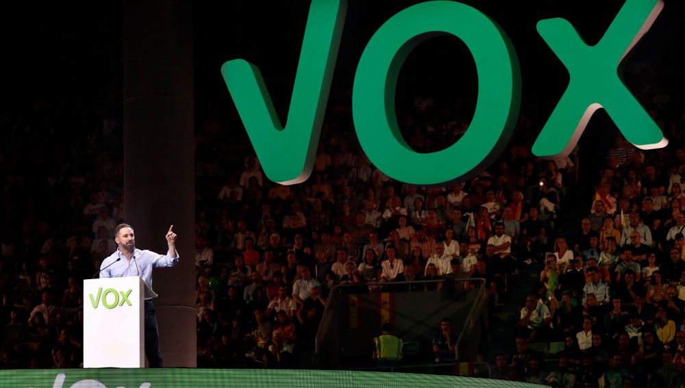 El líder de Vox, Santiago Abascal, durante un acto de precampaña celebrado este domingo en el Palacio de Vistalegre