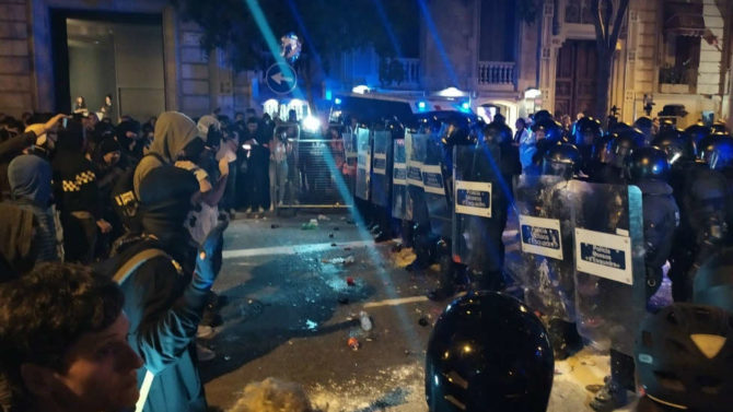 Los manifestantes intentan romper el cordón policial arrancando las vallas que les impiden acceder al edificio y se han producido varias cargas después de sucesivos avisos. Tras lograr reponer las vallas y volver a romper el cordón los manifestantes, los Mossos han vuelto a cargar hasta dos veces más. También han recurrido al lanzamiento de pelotas de foam.