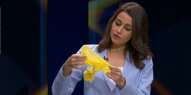 La representante de Ciudadanos ha comenzado a enumerar los motivos por los que su partido intervendrá TV3 si gobierna. “Como muestra de la infamia que es esta televisión, desde las últimas elecciones hasta aquí se ha llamado ‘putos perros de mierda‘ a los Mossos d’Esquadra; desde aquí se ha tratado de nuevo a Otegi como si fuera una superestrella, se justifica la violencia…” y ha añadido que “son ustedes tan sectarios que el día de hoy TV3 está lleno de estos plásticos amarillos, esto lo acabo de quitar yo de una barandilla… son tan sectarios que el día que hacemos el debate, al que venimos todos, son incapaces de mantener la neutralidad”.