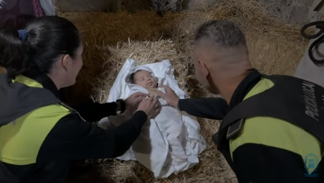 El bebé fue auxiliado por los agentes de una patrulla de la localidad antequerana cuando estaba a punto de morir asfixiado por su propia flema. Sus padres han colaborado en la grabación y disfrutado al ver su bebé interpretando el papel de niño Jesús.