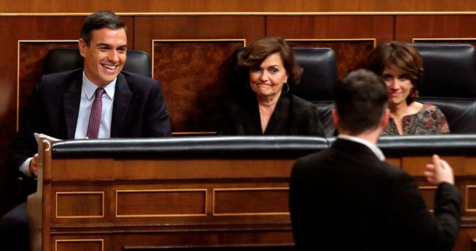 Momentos de tensión en el Congreso de los Diputados en los primeros comapses de la investidura de Pedro Sánchez. En su segunda réplica al líder del PP, Pablo Casado, se produjo uno de los momentos más polémicos de la jornada cuando la bancada popular al unísono coreó «¡ERE, ERE!», en referencia al episodio de corrupción más importante de la historia del PSOE. Lo hacía cuando Sánchez intentaba sacar la cuestión de la corrupción del PP. La presidenta del Congreso, Meritxell Batet, trató de cortar de raíz la protesta: «¿Podemos dejar la plaza del pueblo?».