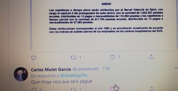 El senador Mulet abundó este jueves en sus argumentos para solicitar la expulsión de los curas de la sanidad pública en una conversación en su cuenta de Twitter, donde sostenía, en relación a la asistencia católica en los hospitales, que «quien tenga vicios que se los pague». Mulet mostraba el convenio que regula los salarios que perciben los curas que trabajan a tiempo completo en los hospitales valencianos, vigente desde 1992 y que se actualiza cada año.