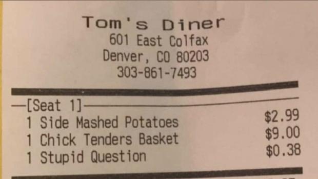 Una «pregunta estúpida» le costó a un cliente 38 centavos de dólar (unos 34 céntimos de euro) en su factura. Es el curioso suplemento del restaurante «Tom’s Diner» en Denver (Colorado, EE.UU.) que está dando la vuelta al mundo.