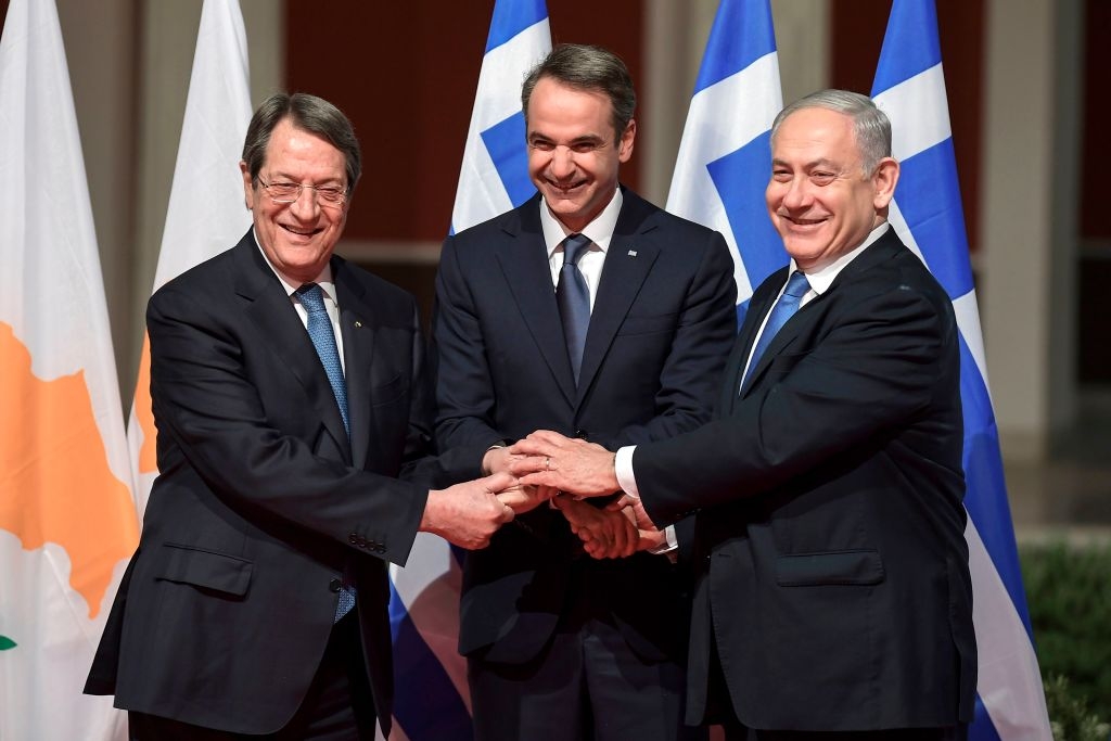 En la imagen: el presidente chipriota, Nikos Anastasiadis (izquierda), el primer ministro griego, Kyriakos Mitsotakis (centro) y el primer ministro israelí, Benjamín Netanyahu, se estrechan la mano en Atenas el 2 de enero, antes de la firma del acuerdo sobre el gasoducto.