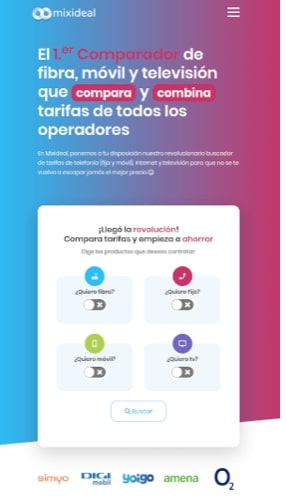 Mixideal es, a grandes rasgos, un comparador online de tarifas de internet, móvil y televisión. Este es un servicio de reciente creación y es que tan solo lleva unos días activo. A pesar de eso, tienen claro el objetivo de esta herramienta: facilitarle al usuario, al máximo, la búsqueda de una nueva compañía y reducirle, a su vez, todos los quebraderos de cabeza que ello conlleva.