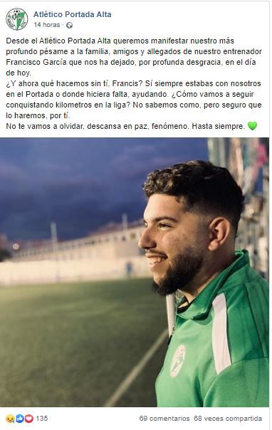 “Desde el Atlético Portada Alta queremos manifestar nuestro más profundo pésame a la familia, amigos y allegados de nuestro entrenador Francisco García que nos ha dejado, por profunda desgracia, en el día de hoy. ¿Y ahora qué hacemos sin tí, Francis? Sí siempre estabas con nosotros en el Portada o donde hiciera falta, ayudando. ¿Cómo vamos a seguir conquistando kilómetros en la liga? No sabemos como, pero seguro que lo haremos, por tí. No te vamos a olvidar, descansa en paz, fenómeno. Hasta siempre”, fue el comunicado que publicó la cuenta oficial del equipo en sus redes sociales.