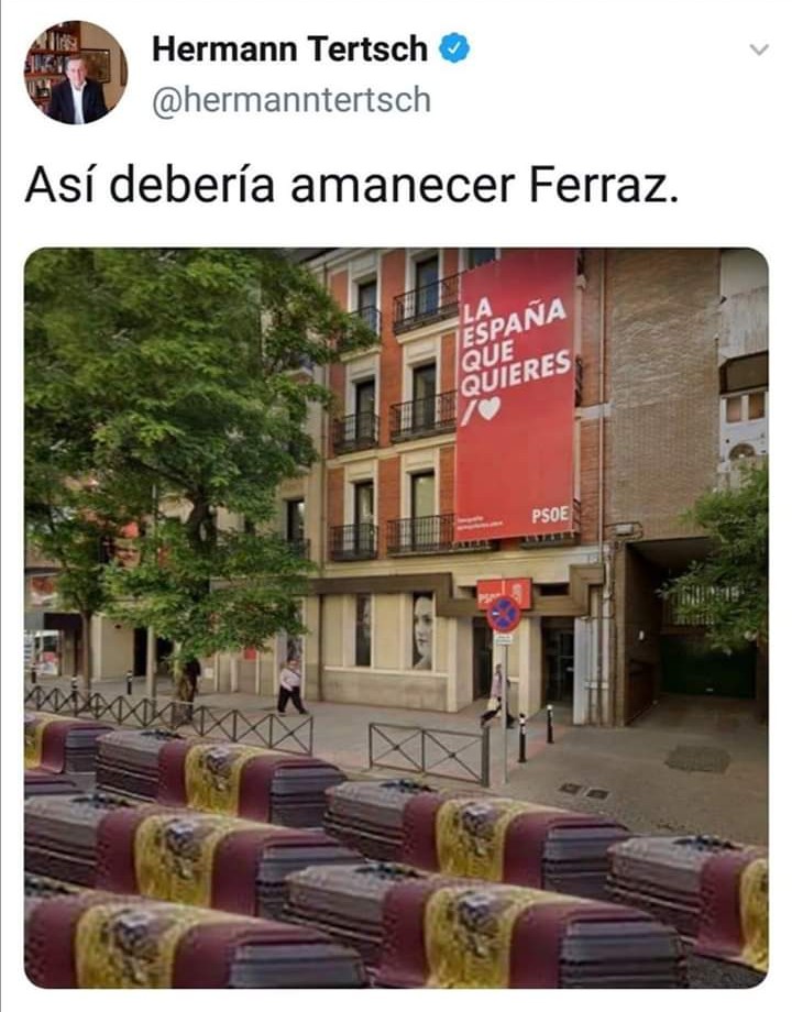 “Así debería amanecer Ferraz”, ha escrito Tertsch en un mensaje al que acompaña un montaje similar al que ya publicó su partido con la Gran Vía llena de ataúdes con la bandera de España.
