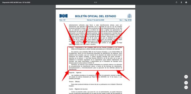 Pues bien, por primera vez un gobierno occidental ha incluido de forma oficial los ‘chemtrail’ en su Boletín Oficial. El Ministerio de Sanidad ha autorizado a las unidades NBQ (Nuclear, Biológico y Químico) de las Fuerzas Armadas y también a la UME para que usen biocidas desde el aire. Un mes después de que se impusiera el estado de alarma, el Ejecutivo justifica en el BOE que esta técnica es una de las “más eficaces” contra el coronavirus ya que con “técnicas de nebulización, termonebulización y micronebulización, se alcanzan todas las superficies con rapidez”.