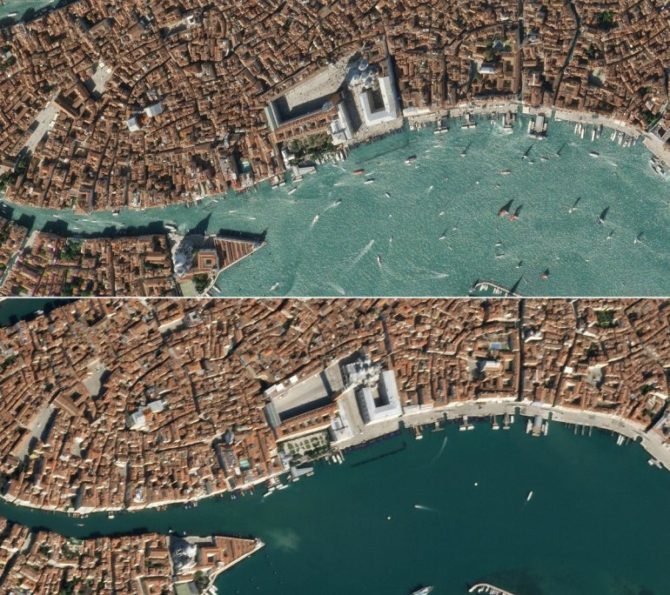 Combinación de fotos creada el 19 de marzo de 2020 utilizando imágenes de sastélites obtenidas por Maxar Technologies que muestran botes en las aguas de la plaza San Marcos, en Venecia, Italia, antes y después de la cuarentena decretada por el coronavirus COVID-19.