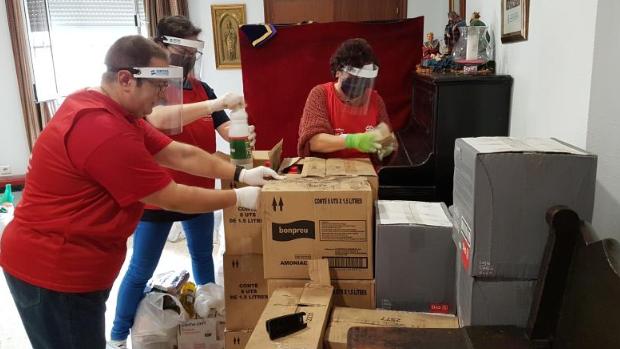 Voluntarios de Cáritas organizan los productos destinados a la ayuda por los afectados por la crisis del coronavirus